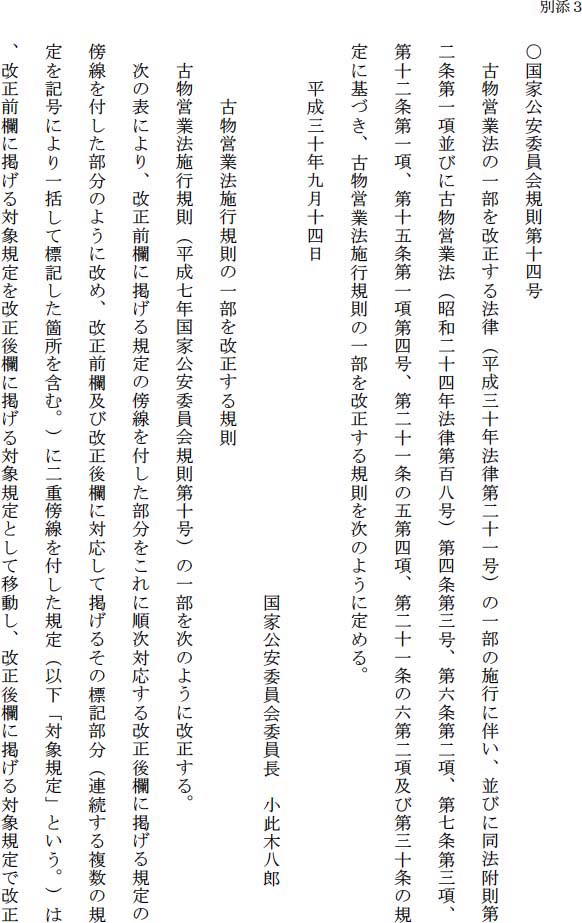 なお、以下この通達において、古物営業法の一部を改正する法律(平成30年法律第21号。以下「改正法」という。別添1及び2参照)による改正後の古物営業法(昭和24年法律第108号)を「法」、古物営業法施行規則の一部を改正する規則(平成30年国家公安委員会規則第14号。以下「改正規則」という。別添3参照)による改正後の古物営業法施行規則(平成7年国家公安委員会規則第10号)を「施行規則」という。