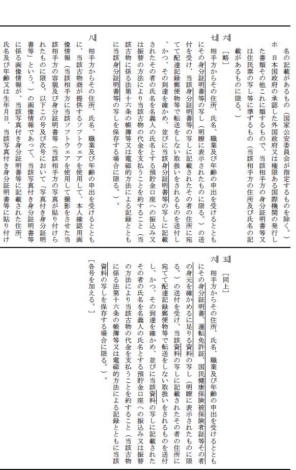 法第15条第1項においては、古物商が、古物を買い受け、若しくは交換をし、又は売却若しくは交換の委託を受けようとするときは、相手方の真偽を確認するため、同項各号のいずれかに掲げる措置を採らなければならない旨規定されており、同項第4号においては、「前3号に掲げるもののほか、これらに準ずる措置として国家公安委員会規則で定めるもの」が掲げられている。この確認方法については、平成29年度に開催された「古物営業の在り方に関する有識者会議」において、確認方法の緩和が要望されたほか、改正法の国会審議においても取り上げられるなど、新たな確認方法の導入を検討する必要性が高まっていた。そこで、古物商におけるインターネット等を利用した非対面取引が急速に普及している実態を踏まえ、相手方の真偽の確認方法として以下の方法が追加された。