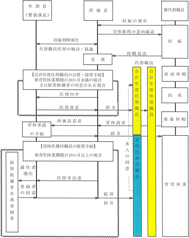 所属長は、職員又は職員の配偶者が妊娠又は出産した場合には、育児休業の取得について当該職員の意向を確認し、速やかに、その旨を県本部警務課長(以下「警務課長」という。)に報告するとともに、代替職員の任用について協議するものとする。