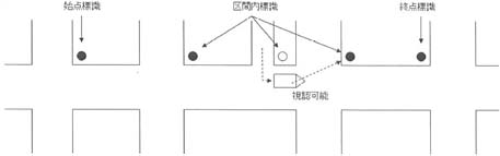 設置方法 | 1 本規制区間の始まり及び終わりの地点における左側の路側に道路標識「並進可(401)」を設置し、始まりの地点に補助標識「始まり(505-A・B)」、終わりの地点に補助標識「終わり(507-A・B・C)」をそれぞれ附置するものとする。この場合、始点標識又は終点標識の設置場所が交差点にかかるときは、交差点からおおむね5~30メートルの距離をおいて設置するものとする(図例参照)。 2 区間内標識の設置は、次により行うものとする。 (1) 区間内標識は、おおむね400メートルの間隔で設置することとするほか、総則に定めるところによるものとする。 (2) 本規制区間内にこれと交差する道路がある場合は、道路及び交通の状況を勘案して、交差点からおおむね5~30メートルの距離をおいて、区間内標識を設置するものとする。 図例