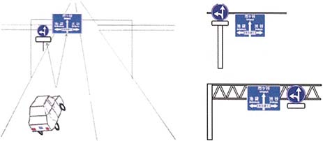 設置方法 | 1 道路標識「規制予告(409-A)」 (1) 標示板の記号は、交通の規制を表示する規制標識又は指示標識に係る様式を用いるものとする。 (2) 標示板の文字は、予告する交通の規制の対象となる車両の種類を特定し、若しくは遠隔操作型小型車が標示板が表示する交通の規制の対象となるかどうかを示すため必要な事項、交通の規制が行われている日又は時間及び規制場所までの距離を表示するものとする(図例(1)、(2)参照)。 2 道路標識「規制予告(409-B)」 標示板には、交通の規制が行われている場所周辺の道路の形状とともに、予告する交通の規制の内容を表示する規制標識及び指示標識の種類に係る様式及びう回させようとする方向を矢印で表示するものとする(図例(3)参照)。 この場合において、標示板の余白部分に方面及び方向を示す文字を表示することができる。 3 オーバー・ヘッド方式又はオーバー・ハング方式による設置 道路標識「規制予告(409-B)」及び車両通行区分の指定等の規制を予告する道路標識「規制予告(409-A)」は、原則としてオーバー・ヘッド方式又はオーバー・ハング方式により設置するものとする(図例(4)参照)。 | ||||