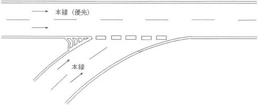 留意事項 | 1 本線車道から他の本線車道に入ろうとする自動車に係る規制なので、本線車道と本線車道が合流する場合に限られることに留意すること。 2 優先本線車道と合流することが容易に認識できるよう警戒標識の設置などの安全対策がなされるように努めること。 | |||