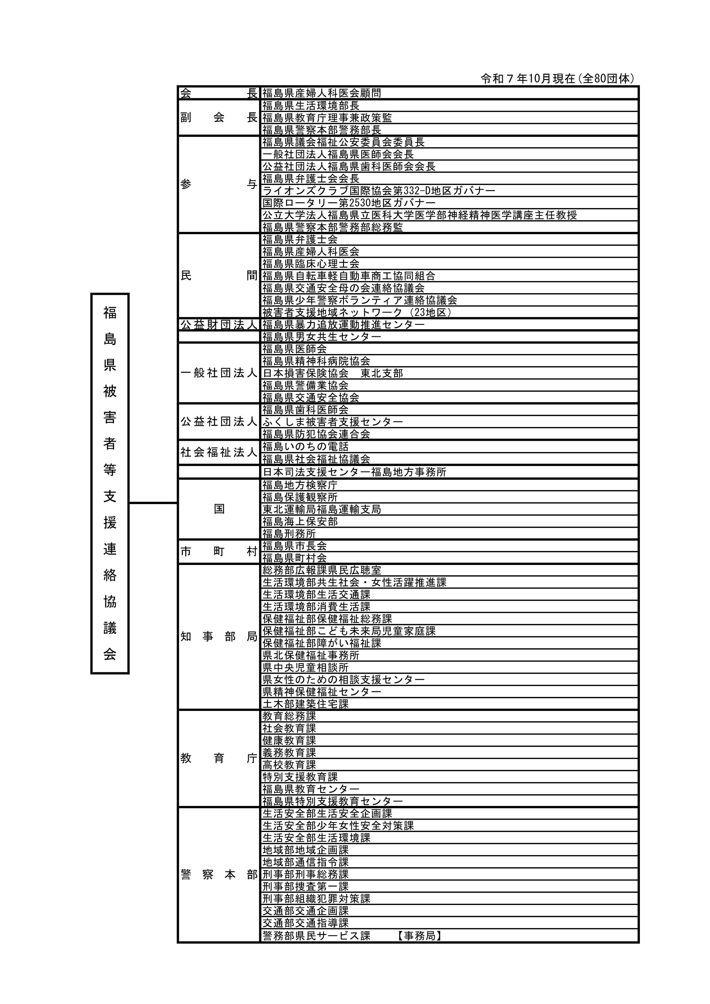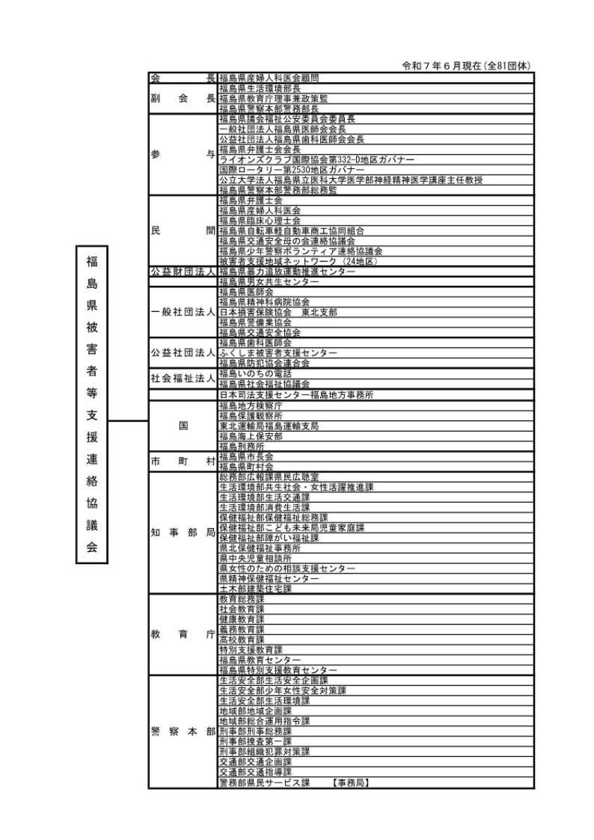 犯罪等による被害者や遺族のニーズは、生活上の支援をはじめ、医療・公判に関することなど多岐にわたっています。 そこで、これらのニーズに的確に対応するため、犯罪等による被害者や遺族に関わりあいのある民間団体、行政、司法機関、教育機関、各種法人等が相互に連携し、情報交換等をしながら、各種の支援活動を組織的かつ効果的に推進することを目的として設立されたのが「福島県被害者等支援連絡協議会」です。
