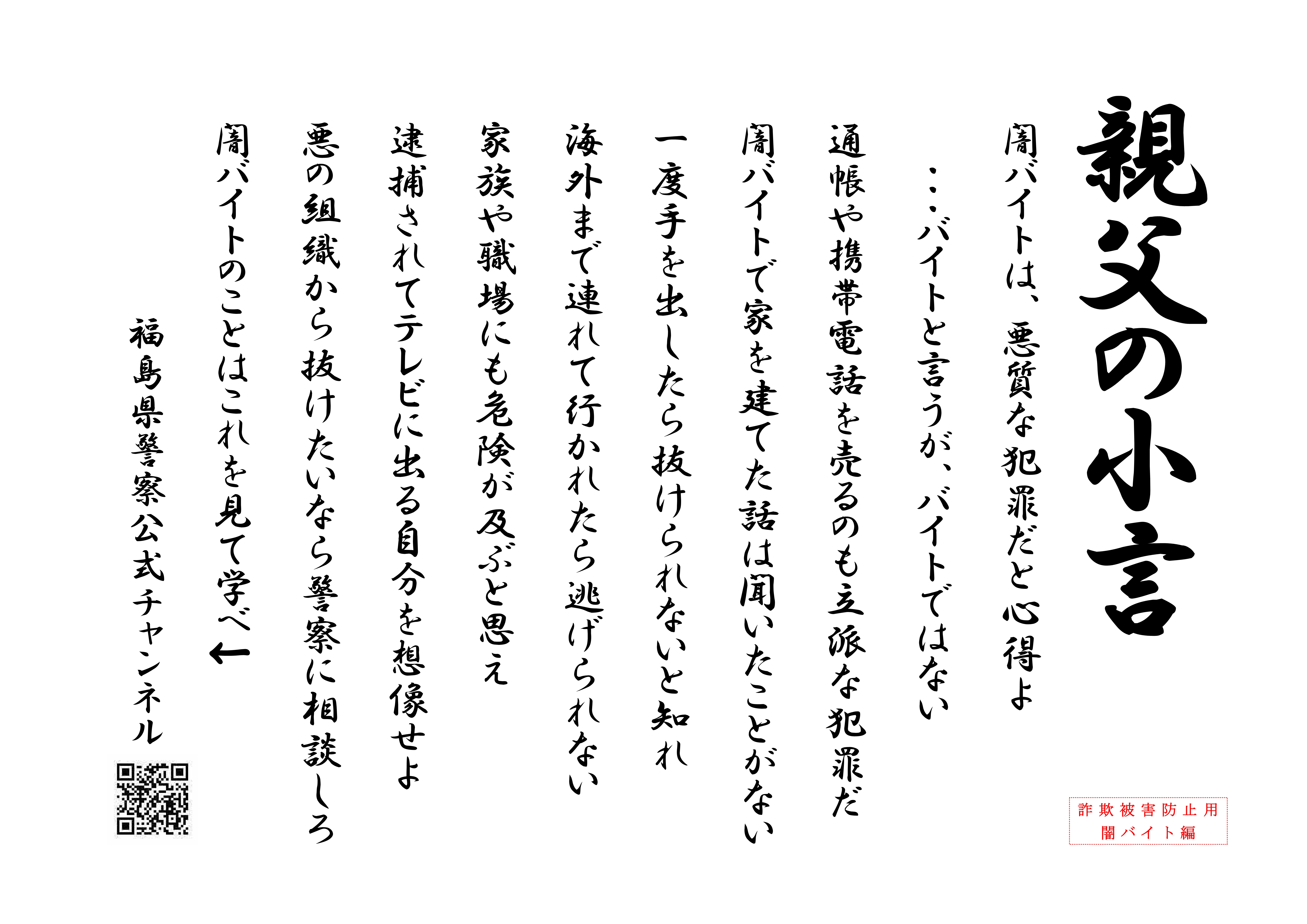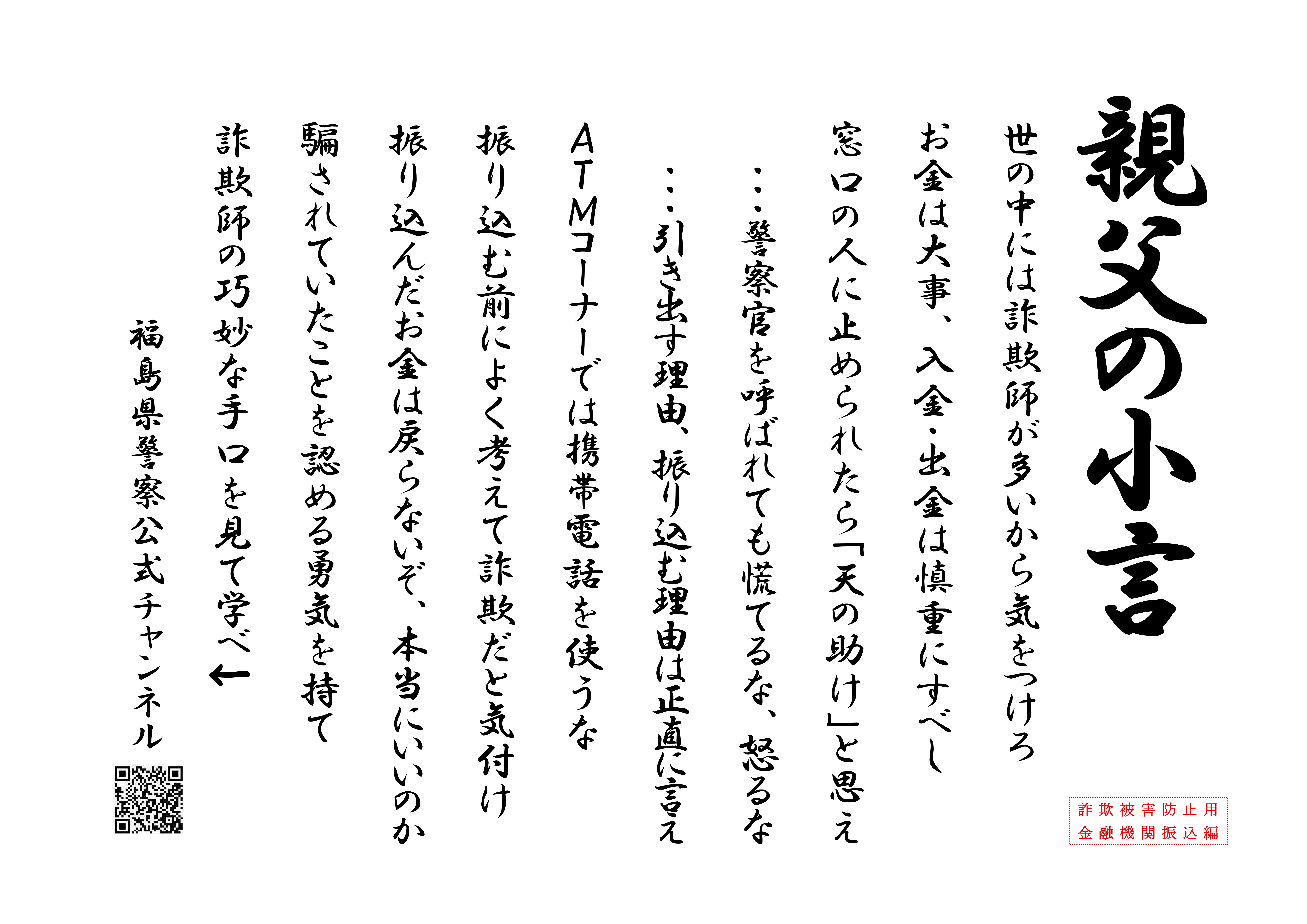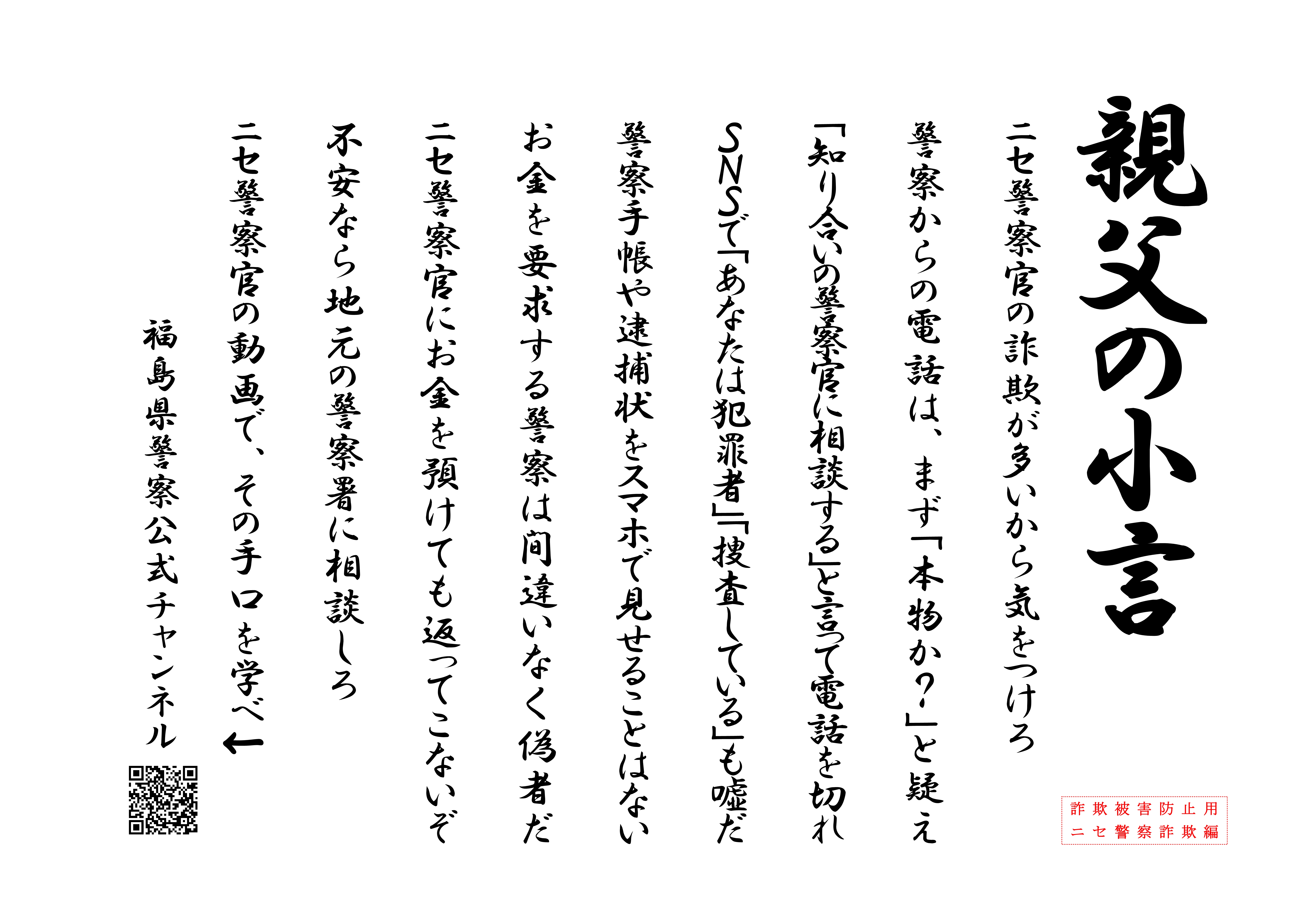 固定電話の前やトイレ、職場など様々な場所に掲載・活用していただき、詐欺被害に遭わないよう気を付けてください!